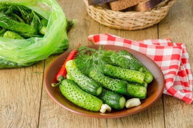 Огурец – это овощ, который можно купить в наших магазинах круглый год. Принято считать, что огурец – это малополезный овощ, состоящий из одной воды. Это совершенно неверное мнение. Огурцы очень полезны для организма. Не менее полезны они и в соленом виде. Рецепт малосольных огурчиков всегда пользуется у хозяек большим спросом. Как правило, солят такие огурцы в какой-то емкости, выдерживая их несколько дней. Но есть очень простые рецепты супер быстрого приготовления малосольных огурцов при помощи простого целлофанового мешочка. Такой способ приготовления очень удобен, когда, например, надо сделать очень быстро закуску из огурчиков к обеду или ужину. Готовятся огурцы быстро, имеют приятный малосольный острый вкус. Для малосольных огурцов быстрого приготовления понадобится: Приготовление Можно приготовить огурцы подобным способом еще быстрее. Их готовят буквально перед накрытием на стол. В указанные выше ингредиенты, следует добавить ложку соевого соуса и ложку оливкового или другого, люб