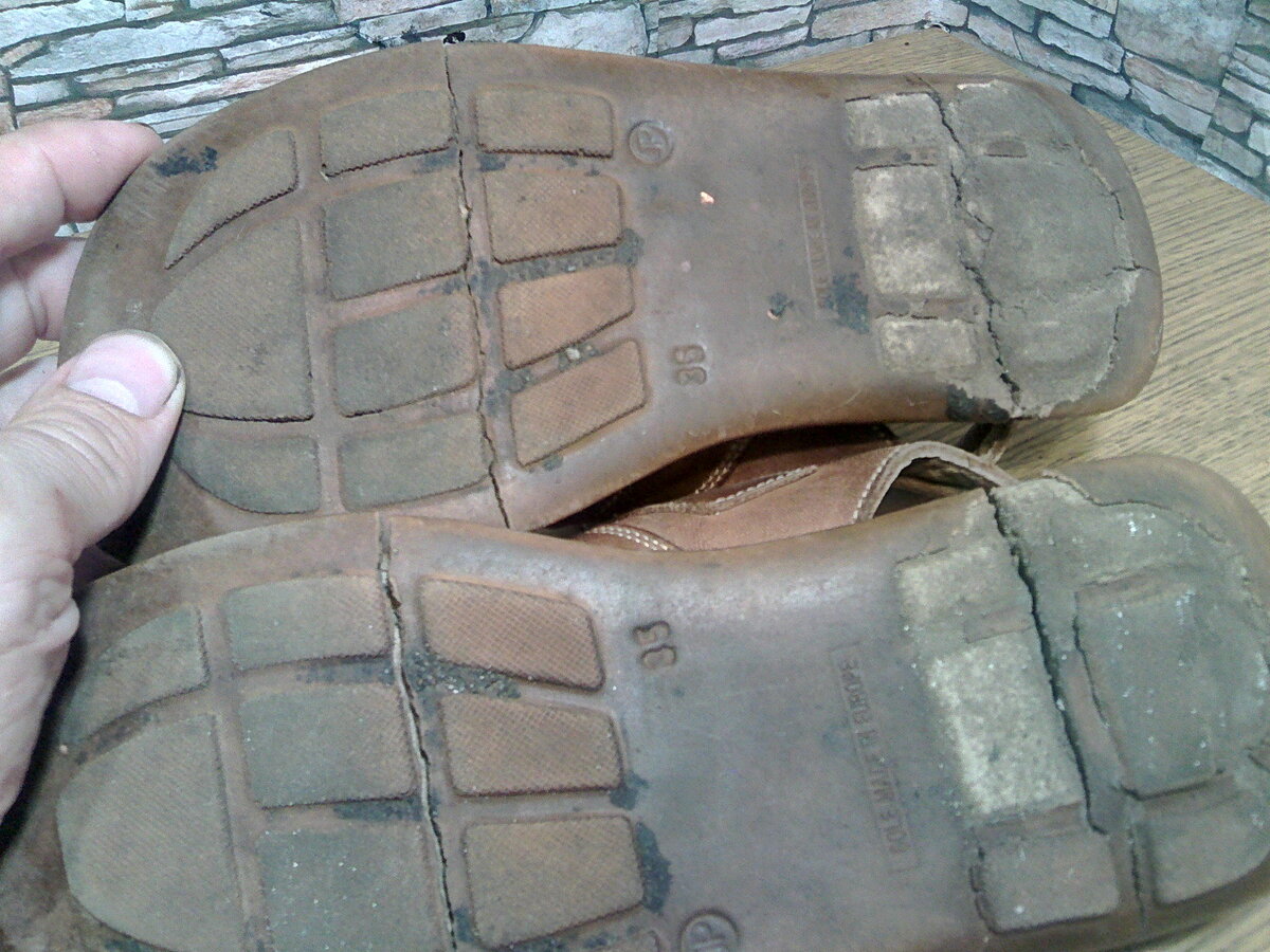 Здравствуйте, друзья! Летние сандалии, подошва сначала растрескалась, затем стала расслаиваться. Дальше она стала бы отваливаться кусками, но у заказчика не хватило терпения - отдал мне. Перед разборкой смотрим высоту - нам надо сохранить ту, которая была. Исходим их того, что если человек в них ходил столько времени, значит, ему было удобно, а других указаний получено не было. Разбираем. Материал практически уже не держится. Будем использовать микропористую резину толщиной 22мм. Её толщина позволяет выточить подошву цельную, но это долго, муторно и пыльно. Поэтому поступим канонично: возвышение пяточной части выполним отдельной деталью. Раздваиваем заготовку. Попутно приклеим и пришьём подпяточник из кожи - стелька в этом месте уже поизносилась. Клеим малярную ленту, обводим карандашом контуры. На фотографии внизу старая декоративная деталь - логотип на ней уже давно не различим. У полученной детали брусуем передний край, вклеиваем и прошиваем. Зачищаем детали возвышения. Намазывае