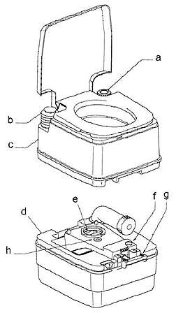 В верхней части - вода, в нижней - отходы. Вода заливается через отверстие (а). Смыв происходит с помощью помпы (b). Заслонка (e) герметично закрывает нижний бак. Заслонка открывается ручкой (g) после использования, чтобы всё из чаши унитаза плюхнулось вниз, и тут же закрывается.