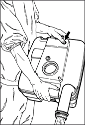 Левой рукой человек держит кнопку воздушного клапана, она позволяет избежать булькания и разбрызгивания при сливе. В дешёвых моделях этой кнопки нет.