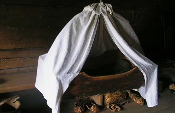 Чаще всего наши предки крепили зыбку к очепу — длинной гибкой жерди, которая одним концом проходила через кольцо на потолочной балке (матице), а другим упиралась в стену. Н
