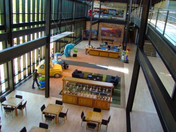 «Если вы можете это вообразить, сможете и сделать!» - сказал Уолт Дисней и вообразил целый мир. Компания Pixar стала частью этого мира и вошла в холдинг Дисней 10 лет назад. Полез в кузов - соответствуй! Не отставай от остальных успешных дочерних компаний Дисней. Так и Pixar держит марку, в рабочей среде особенно. Добро пожаловать в мульти-вселенную! Такой девиз мог бы украсить вход офиса Pixar в Калифорнии. Концепция рабочего пространства базируется на трех столпах: спонтанность, открытость, коммуникабельность. Косвенно повлиял на нее Стив Джобс. Основатель «яблока» считал, что лучшие идеи всегда спонтанны, рождаются в случайных встречах. Компания Pixar создала все условия для этого. Центр притяжения сотрудников - большой атриум прямо в центре. Здесь устраивают brain-штормы, проводят собрания и просто отдыхают. Он настолько велик, что сотрудники перемещаются по нему на самокатах. Какой дизайн у атриума? Разный, в зависимости от того, какой мультфильм создают в Pixar. И