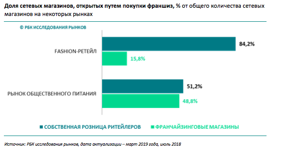 По данным РБК Исследования рынков, число франчайзинговых магазинов на российском рынке одежды уменьшилось за год с 18,5% до 15,8% от общего количества точек продаж. Сократилась и доля сетей, открывающих магазины по франшизе. Таким образом, за период наблюдений с 2016 по 2019 гг. происходило постепенное снижение роли франчайзинга на рынке. Франчайзеры отталкиваются от финансовых возможностей потенциальных партнеров, а условий для их роста в последние несколько лет не прослеживалось. Как отметил президент компании Baon, Илья Ярошенко, «Магазинам-партнерам сложно работать в условиях роста арендных ставок, падения маржинальности и роста онлайн-продаж». Поэтому компании не строят амбициозных планов по увеличению партнерских сетей. Тем не менее, ретейлеры, которые традиционно развивали франчайзинговое направление, стараются поддерживать партнеров или идти навстречу потенциальным франчайзи. Франчайзинг остается для них важным каналом продаж. Так, Ксения Рясова, президент Finn Flare, отмеч