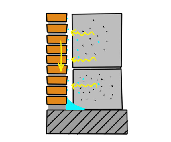 Газоблочная стена обладает достаточно высокой паропроницаемостью, поэтому пары из дома проходят через толщу стены и конденсируются на облицовке из кирпича. Конденсат стекает вниз по вертикальной поверхности. Если не организовать дренажного отверстия, то вода будет скапливаться в нижней части стены.