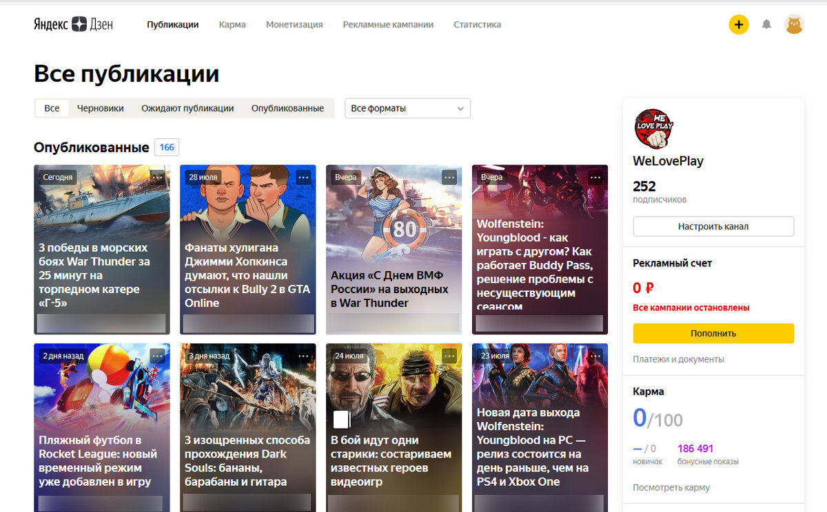 Раньше я думала, что обнуление кармы в Дзене по ошибке просто невозможно. Но, зайдя сегодня в редактор, чтобы посмотреть новые показатели кармы в 12:00, у меня чуть не остановилось сердце. Карма обнулилась, а при заходе в подробную статистику говорилось, что я создала менее 3 публикаций за 3 недели. Я-то знаю, что мной писалось минимум по 1 статье в сутки. Вторая мысль — может это бан? Хотя предпосылок к этому не было, я совсем не пользуюсь кликбейтными заголовками и не нарушаю никаких правил ведения канала в Дзене. Да и рекламные блоки в материалах выводятся. А после бана, по словам местных опытных блогеров, рекламу выключают. Поползала по различным тематическим форумам, где пользователи делятся опытом ведения каналов в Дзене. И там некоторые тоже стали писать, что карма обнулилась. На этом моменте выдохнула. Ведь это значит, что произошел какой-то массовый сбой. Но он меня действительно напугал! Ведь я веду канал уже год (с 23 июля 2018). И очень не хочется в один миг распрощаться со