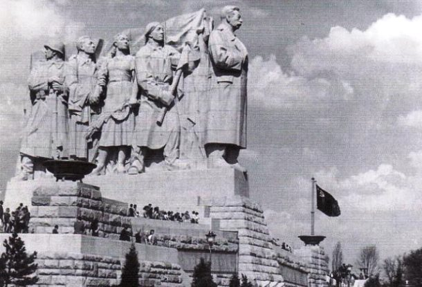 Автор проекта, Отакар Швец, на открытии не присутствовал. Незадолго до окончания работ он отравился. Самоубийство Швеца обычно объясняют тем, что он вообще не собирался участвовать в конкурсе, но его, как и многих других скульпторов, подписали на это в добровольно-принудительном порядке правительственные чиновники. Он привык работать совсем в иной манере и до последнего не верил, что проект займет первое место. А потом - что его реально будут воплощать. В итоге его задергали и коллеги, и местная госбезопасность, придиравшаяся по любым мелочам (в первоначальном проекте, например, солдаты стояли сразу за спиной Сталина, и скульптору было велено передвинуть их, чтобы не казалось, что они не охраняют советского лидера, а конвоируют его).
