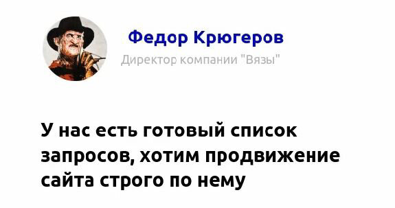 Споры о лучшей стратегии и «удобных» инструментах продвижения между заказчиками и SEO-отделом возникают на протяжении всего сотрудничества. В результате возникают проблемы, на решение которых уходит много времени. Мы собрали Топ-10 самых распространенных фраз, замедляющих успешность проекта, которые слышат SEO-специалисты от владельцев сайтов и их штатных менеджеров. Рассмотрим первопричины таких решений и объясним, чем они мешают работе. Большинство заказчиков уверены, что только они знают, чего хотят их клиенты, поэтому составленный ими перечень ключевых фраз для семантического ядра сайта, наилучший. При этом очень часто заказчик просто не прислушивается к аргументам SEO-специалиста. Предложение со стороны сеошников подкорректировать структуру сайта, особенно иерархию каталогов, воспринимается заказчиками критически. Самый главный довод: «И так все хорошо работает, наши постоянные клиенты привыкли к тому, что есть». Постоянные клиенты привыкли. А как же тогда привлекать новых клиент