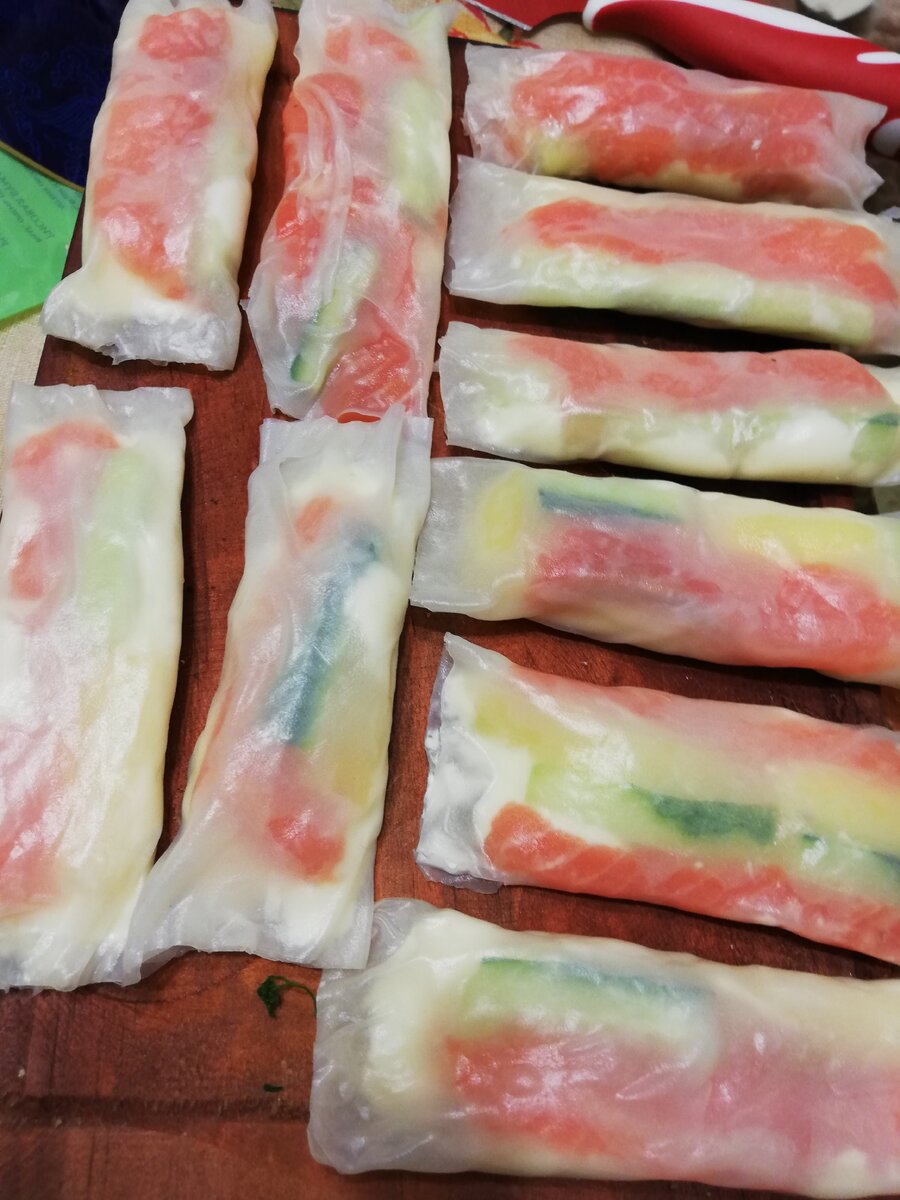 Добрый день. Сегодня поделюсь с вами рецептиком рол, которые очень нравятся нам с мужем. Что вам потребуется? С первого взгляда все кажется таким сложным, но нет. Рисовую бумагу можно найти в отделе "для суши" в любом магните, как это сделала я. Смотрите сколько рисовых полотен в одной упаковке, можно купить чуть по дороже, но там будет 60 полотен, вместо 12. Будьте внимательны Твороженный сыр можно взять по акции, а на развес дешевле конечно. Советую взять на развес. Мне кажется такой сыр более мягкий. ( нужно где то 400 грамм на 25 полотен, чтобы былы добротный ролены). Сейчас зезон овощей, поэтому взять 2 небольших огурца и один перчик не составит больших затрат (или сорвать с грядки). А рыба - это дело вашего вкуса. Можно взять всю рыбу, порезать её на стейки, уху и выделить немного на засолку для ролов, но не у всех есть такие дегьги, поэтому берём в магазине понравившиюся упаковочку рыбки в вакуумной упаковке. У меня вышло - 200 рублей засолененький лосось. 120 рублей - Фи