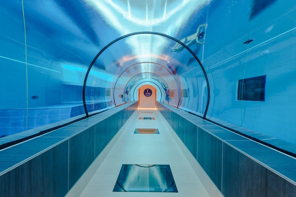 За последние несколько десятков лет отели в разных уголках мира пытаются привлечь туристов чем-то необычным и выдающимся, не исключением оказался и отель Terme Millepini в Италии. Именно здесь находится самый глубокий в мире бассейн под названием Y-40. Глубина этого бассейна составляет 40 метров, а сделан он специально для любителей понырять и дайверов. Сначала может показаться, что это просто тоннель, вырытый вертикально вглубь, однако это не так. На самом же деле бассейн представляет из себя серию отсеков, которые помещены на промежуточные уровни. Из-за этого для обычных туристов создается впечатление, как-будто бы это обычный и ничем не примечательный бассейн. Но если посмотреть на дно, то дна можно и не увидеть, ведь перед вами открывается настоящая голубая бездна. Выглядит очень захватывающе. Ещё одним интересным фактом бассейна Y-40 является то, что для его наполнения используется термальная вода, которая имеет температуру 33°C. А для тех, кто не умеет плавать, архитекторы от