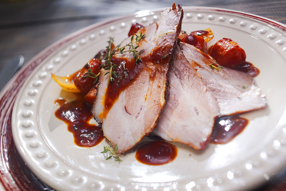 Свиная грудинка в томатно-медовом соусе - изысканное блюдо для праздничного стола. Словно оригинальный аксессуар, соус эффектно подчеркивает вкус мяса, добавляя ему особого шарма. А гречневый мёд добавляет блюду пикантности. Благодаря такому маринаду, мясо приобретает румяную корочку с красивым блеском. Ингредиенты 1. кетчуп — 200 г 2. свиная грудинка — 500 г 3. соль, перец — по вкусу 4. гречневый мед (можно любой) — 100 г 5. соевый соус — 50 г 6. имбирь — 20 г 7. чеснок — 2 зубка 8. тимьян — 2 г 9. вода — 50 мл 10. репчатый лук — 1 шт. 11. морковь — 1 шт. 12. растительное масло — 15 мл. Рецепт 1. Грудинку натереть солью и перцем, нашпиговать чесноком и тимьяном, обмазать 100 г кетчупа и оставить мариноваться на 60 минут. 2. Лук нарезать большими дольками, морковь — бочонками. Поджарить на раскаленной сковороде. 3. Обжарить грудинку с двух сторон на растительном масле и уложить ее в жарочную форму с овощами. Добавить 100 г кетчупа, воду, мед, соевый соус. 4. Выпекать 2,5 ча