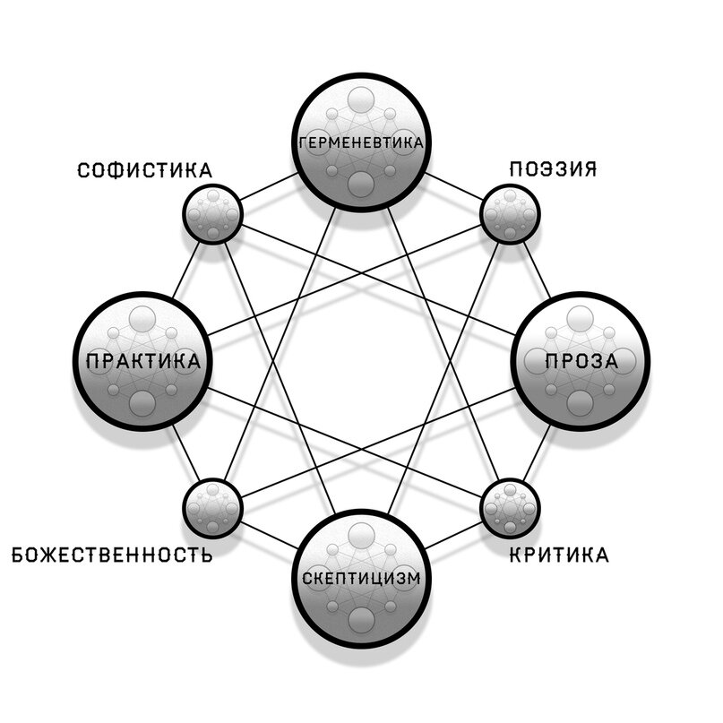Связь с другими аспектами. Герменевтика содержит в себе направленность ортодоксологии как учения. Все остальные аспекты являются в некотором роде сопутствующими, хотя скептицизм, необходимый для понимания, и достигается благодаря значительнейшим интеллектуальным усилиям. Скептицизм – фундамент понимания. Проза – метод конструирования событий и персонажей. Поэзия – метод конструирования эмоции, а также метод мгновенного акта понимания. Духовные практики ортодоксологии – ведут к расширению себя и в итоге к пониманию. Все это нужно для герменевтики, впрочем, все эти сферы требуют определенной степени развития понимания. Даже критика необходима, так как она учит критиковать, а критикуют практически все (тот, кто никого не критикует, не сможешь понять критикующих).