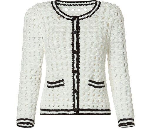 Сегодня хочу поделиться с Вами интересной моделью – жакет в стиле Шанель с карманами, связанный крючком. Для размеров 36/38 (40/42) Вам потребуется 850 (900) г голубой пряжи Rotonda (100% микроволокна, 130м/50г), 500 (550) г белой Toccata Fino (100% хлопка, 160м/50г) и 50 г салатной India Cotton (56% микроволокна, 44% хлопка 50м/50г); крючки № 4 и 5; 6 пуговиц в тон пряжи. Белой и голубой пряжей вяжем вместе. Основной узор: вяжем по схеме (число петель кратно 6+2+3 возд. п. подъема. Заменяем 1-й столбик каждого ряда 3 возд. п. подъема. Начинаем с петли перед раппортом, повторять раппорт нужное количество раз и заканчиваем петлей после раппорта. Повторяем 1 раз с 1-го по 5-й ряд, а затем со 2-го по 5-й ряд. Выкройку делаем в натуральную величину. Спинка: набираем 86 (98) возд. п., вяжем основным узором 34 см. и оставляем с обеих сторон для пройм по 6 ст. = 74(86) ст. Через 50(52) см от наборного края оставляем с обеих сторон для скоса плечей 2 раза по 13(16) ст. Через 52(54) см. заканч