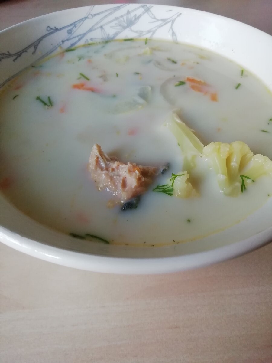 Очень вкусный и сытный суп, к тому же быстро готовится. На 1,5 л воды потребуется: банка лосося лук средний - 1 шт. морковь маленькая - 1 шт. молоко - 150 мл капуста цветная - маленький кочан картофель средний - 1 шт. соль, специи - по вкусу Овощи помыть, почистить. Лук порезать полукольцами, картофель - кубиками. Морковь потереть на крупной тёрке. Цветную капусту разобрать на соцветия. Я предварительно варю несколько минут шкурку от солёной сёмги, но можно без неё. В кипящую воду бросить щепотку соли, положить лук и картофель. Когда вода закипит, отправить в кастрюлю морковь и капусту. Варить до готовности овощей, минут 12-15. Лосось в банке разделить на кусочки, добавить в суп. Налить молоко. Добавить соли и специи. У меня "Универсальная" из Магнита. Хорошо бы добавить креветок, но у меня не было. Так тоже очень вкусно. Суп закипел - выключить, посыпать укропом. Приятного аппетита! Пожалуйста🙏, ставьте лайк, подписывайтесь на канал – будет много интересных рецептов👏👍, многие и