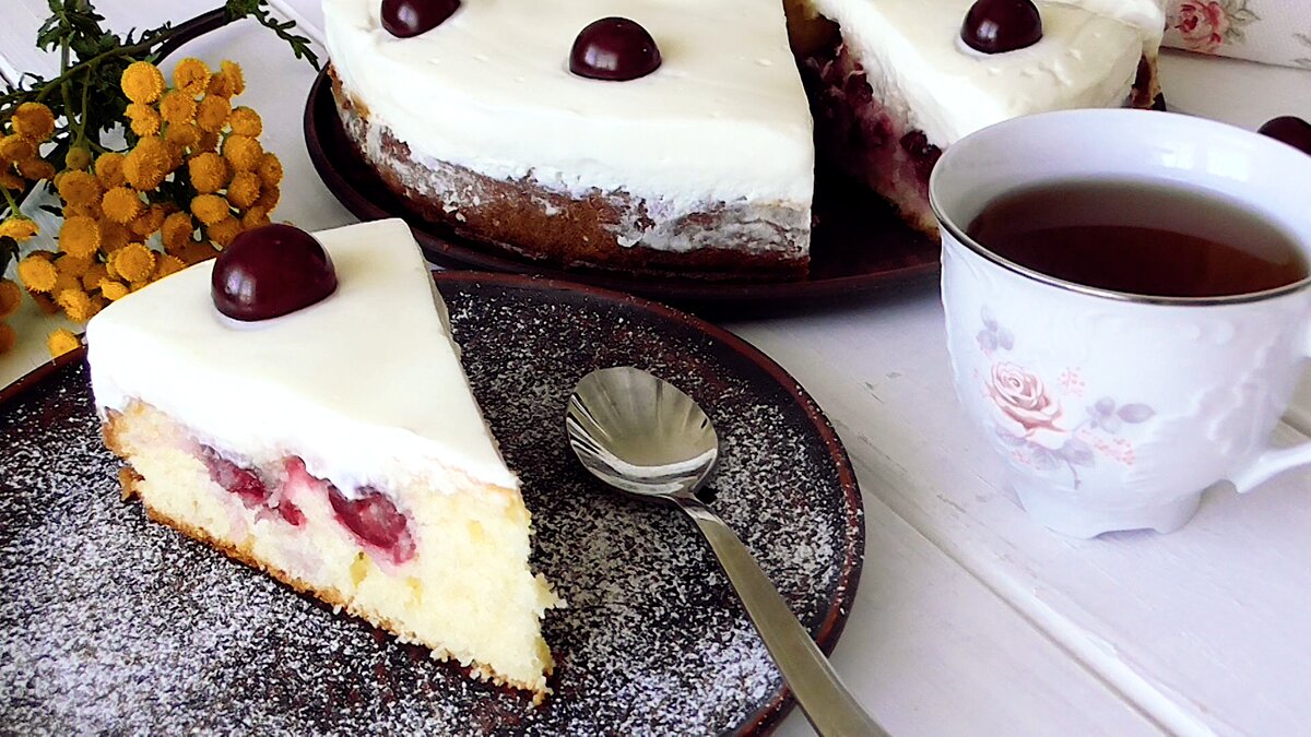 Сегодня я для вас припасла самый вкусный пирог с очень приятным названием *Ягодное наслаждение*! У него просто волшебный вкус и нежнейшая текстура! Лёгкое тесто прекрасно сочетается с ягодами, а завершает всё это вкусный сметанный крем! Этот пирог можно назвать праздничным и для особых случаев уж очень хорош собой! Для него можно использовать любую ягоду, даже замороженную, только предварительно её разморозить и слить лишнюю жидкость! И так, меньше слов, приступим к делу! Короткое видео по приготовлению🎬 Ингредиенты📝 *Тесто* -270 гр муки -2 яйца -120 гр сахара -120 гр мягкого сливочного масла -180 гр сметаны -1.5 ч.л разрыхлителя -2 ч.л ванильного сахара *Крем* -500 гр жирной сметаны 20 и более % -100 гр сахара -250-300 вишни Приготовление✅ 1.При помощи трубочки для коктейля вынуть косточки из вишни. 2.Для теста в чаше взбить мягкое сливочное масло с сахаром и ванильным сахаром около 1 минуты. 3.По одному добавить яйца, каждый раз хорошо прорабатывая миксером. 4.Добавить сметан