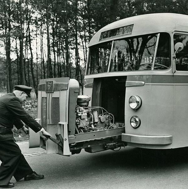 Проблема с доступом к двигателю для его ремонта и обслуживания – характерная особенность большинства автобусов прошлого, да и нынешнего времени. Инженеры всячески старались облегчить жизнь механикам, и в результате их стараний, порой, получались забавные аппараты. В 1949 году DAF совместно с кузовостроительной компанией Domburg создали необычный автобус. С виду он ничем особо не выделялся, но если подойти к передней его части, к решетке радиатора, потянуть на себя две массивные ручки, то двигатель, вместе с коробкой передач, можно было «достать» из автобуса, в буквальном смысле, выкатив его вместе с подрамником. В таком положении мотор можно легко обслуживать, ремонтировать, и даже снять его вообще с подрамника можно при помощи обычной лебедки. Такое необычное решение имело свои плюсы и минусы. Салон автобуса полностью изолирован от мотора, там нет съемных кожухов, как в наших «Пазиках», например. Поэтому попадание выхлопных газов и технических запахов в салон исключено. Благодаря х