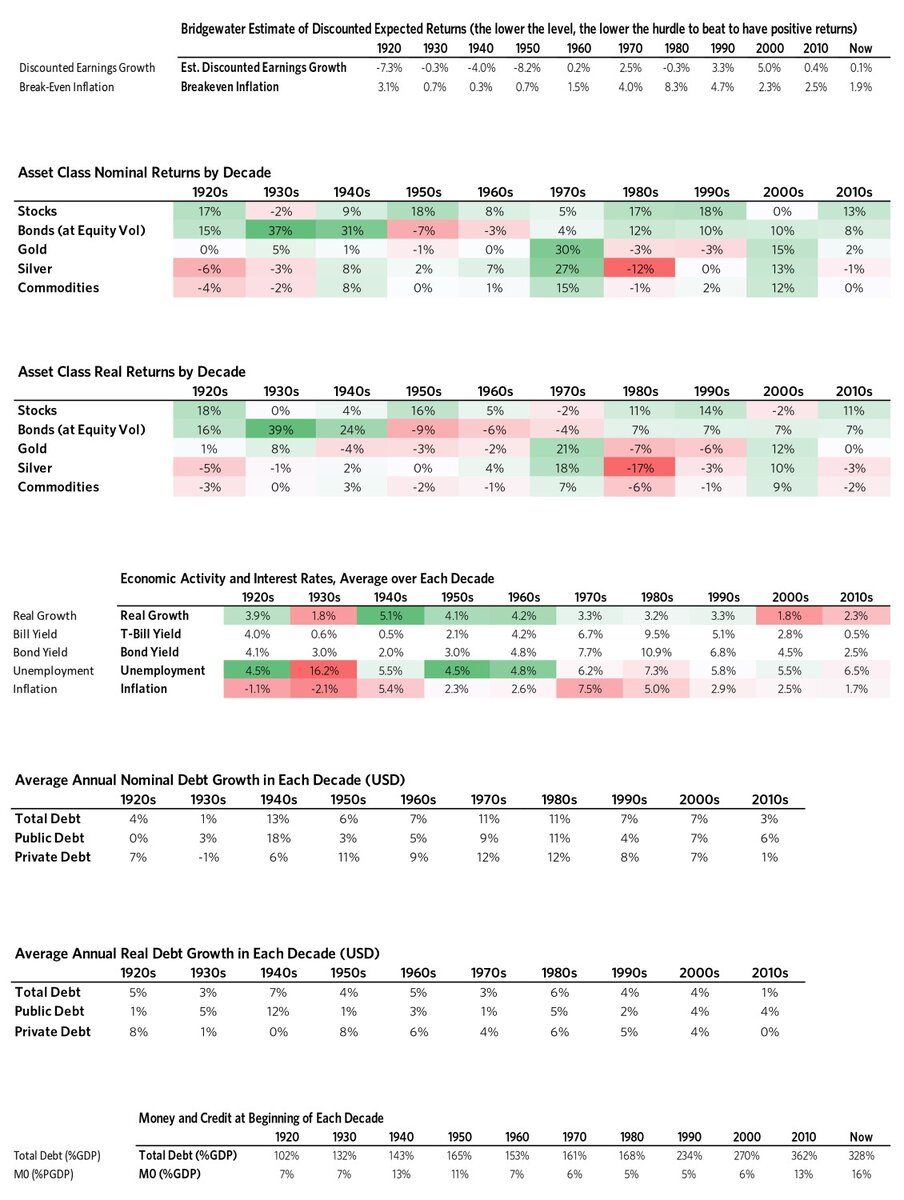- Количество долгов возрастёт и долговые обязательства (например, пенсии и здравоохранение) не будут финансироваться за счёт активов. Иными словами, я думаю, что парадигма, в которой мы находимся, скорее всего, закончится при а) реальная процентная ставка будет снижена настолько низко, что инвесторы сдерживающие долг, перестанут его сдерживать и начнут переходить к чему-то, что им покажется более выгодным. б) одновременно большая потребность в деньгах для финансирования обязательств будет способствовать «большому сокращению». В этот момент не будет достаточно денег для удовлетворения потребностей, поэтому должна быть некая комбинация дефицита. Скорее всего, в течение этого времени держатели долга получат очень низкую или отрицательную номинальную и реальную прибыль в ослабевающих валютах, которые фактически будут налогом на богатство.