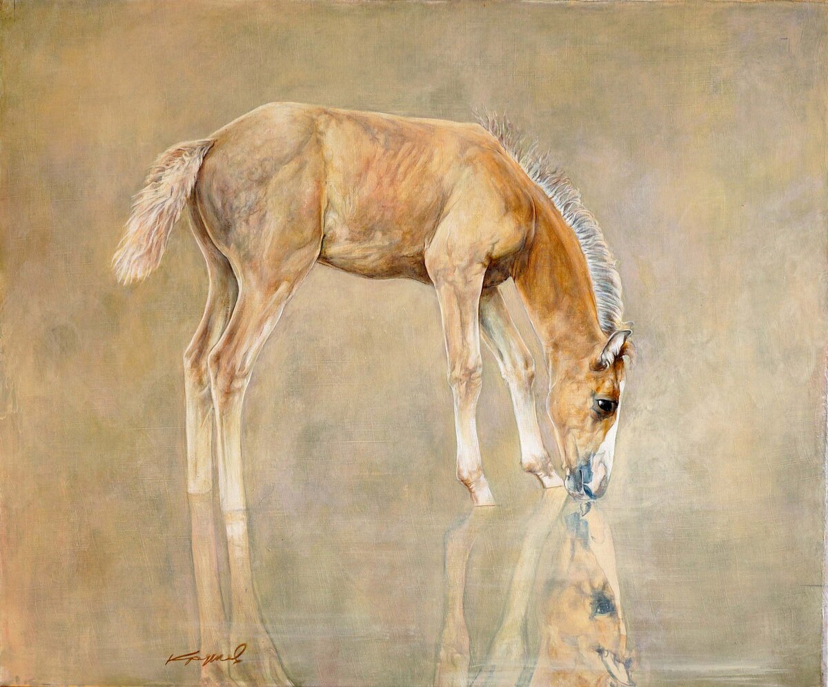 Владимир Кряжев "Жеребёнок" 71х85 хм 2019 г Однажды в разговоре художник Владимир Кряжев признался, что подумывал приобрести цистерну дизельного топлива для отправки в родную деревню на Алтае. Эту картину с пьющим жеребёночком он называет «иконой современной деревни». Болит сердце, и беспокоится душа у автора за судьбу «малой родины». Вроде бы и нет особого повода для беспокойства, но то и дело приходят из деревенского дома нерадостные весточки. Вот, например, нет топлива на посевную кампанию. Чем он, художник, может помочь односельчанам? Рассматривая эту картину, я, перегруженный различными штампами, отметил, что автор в центр композиции поставил кольцо, где понятия Навь и Явь, хотел этого автор или нет, явственно приобретают символ неисчерпаемой жизненной силы деревни. Прошлой, настоящей и будущей жизни. Если вглядеться в отражение головы жеребёнка, начинаешь слышать, как он втягивает в себя воду, и с каждым глотком всё больше и больше приобретает материальные черты. Так приходит п