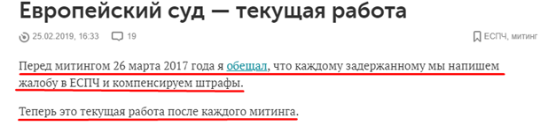 В конце февраля Алексей Навальный напомнил о данном им два года назад обещании компенсировать штрафы и подавать жалобы в ЕСПЧ всем задержанным на митингах. По его словам, такая материальная поддержка сейчас является чуть ли не «текущей работой». Спустя некоторое время, в апреле 2019 года это подтвердил и Леонид Волков, заявив, что все «незаконные» штрафы компенсируются из средств штаба и якобы их набралось уже более 20 млн рублей. Правда, никаких подтверждений этому, кроме собственно слов Волкова, нет. Интересно, что после того, как Навальный пообещал помогать с компенсацией штрафов за участие в митингах, он формально ни разу не выступил в качестве организатора акции протеста, где были бы задержаны участники. Но он, тем не менее, активно привлекал людей к участию в несанкционированном марше в защиту Ивана Голунова 12 июня, сразу после официального освобождения и оправдания журналиста. Как мы помним, на митинге действительно задерживали нарушающих порядок активистов, число