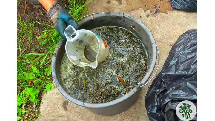 Выставляем на солнце и оставляем на 2-3 дня. После того, как мешок постоит на солнце столько дней, то трава начинает ферментироваться. После 3-ёх дней мы достаём траву и кладём её в ведро на 1/3. Затем до краёв наливаем воду. Лучше колодезную или дождевую.