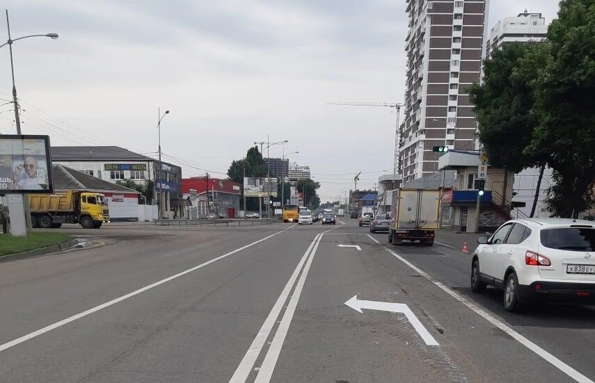 Поскольку по ул. Бородинской ширина проезжей части позволяет добавить по полосе движения в каждую сторону, то на подъездах к пересечению с ул. Почтовой поменяли разметку. При движении как из центра города, так и в центр добавили по одной полосе только для поворота налево.