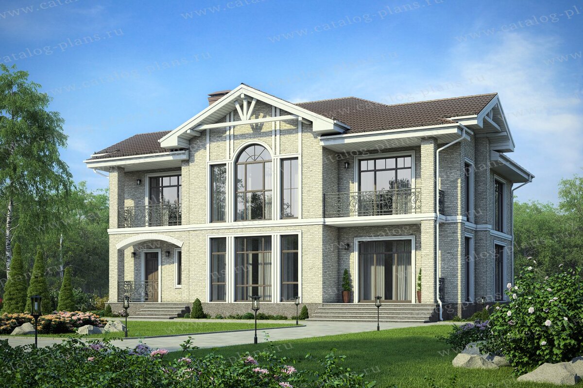 Этот проект двухэтажного жилого дома с чердачной крышей и террасой отлично подойдет для постоянной жизни большой семьи. Его просторная общая площадь в 311 квадратных метров позволила архитекторам предусмотреть все необходимые для комфортной жизни пространства. Габаритные размеры дома: 14х15 метров. Этот дом запроектирован из кирпича, что является несомненным преимуществом. В качестве фундамента и перекрытий выбран монолитный железобетон. Снаружи дом отделан лицевым кирпичом, искусственным камнем и другими декоративными элементами. Акцентом центрального фасада являются два крыльца на первом этаже. Попасть в дом можно через любое крыльцо, а также пройдя через террасу с обратной стороны дома. Если зайти в дом через левое крыльцо, то вы попадете в бойлерную, совмещенную с санузлом, а если через правое крыльцо, то окажетесь в небольшой удобной прихожей. Планировка этого дома немного нестандартна. К примеру, в центре дома располагается не общий холл, а просторная гостиная, объединённая со ст