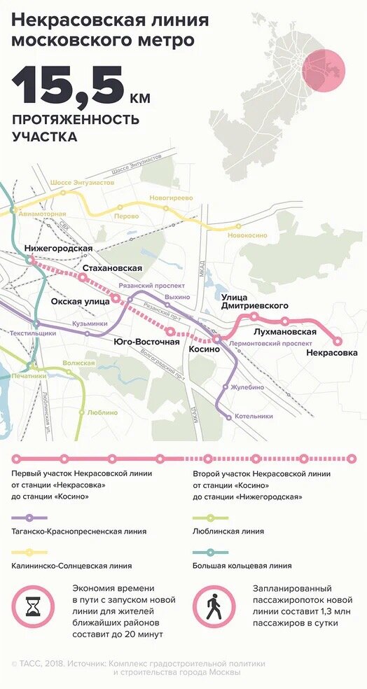 Восемь станций расположатся на новой Некрасовской линии метро. На пяти из них появятся транспортно-пересадочные узлы (ТПУ), сообщает пресс-служба комплекса градостроительной политики и строительства. Это будут ТПУ "Рязанская", "Юго-Восточная", "Лермонтовский проспект", "Улица Дмитриевского" и "Некрасовка". Как рассказал заммэра Москвы по градостроительной политике и строительству Марат Хуснуллин, крупнейшим из них станет ТПУ "Рязанская". Он объединит в себе пересадки на метро и железную дорогу. По словам заммэра, этот транспортно-пересадочный комплекс фактически станет мультимодальным вокзалом. Прогнозируемый пассажиропоток составит около 111 тысяч человек в часы пик. "ТПУ объединит транспортные потоки Большой кольцевой и Некрасовской линий метро, Московского центрального кольца и радиального направления железной дороги. Рядом находится Рязанский проспект и в будущем пройдет участок проектируемой Юго-Восточной хорды", – подчеркнул он. Ранее Сергей Собянин осмотрел ход строительств