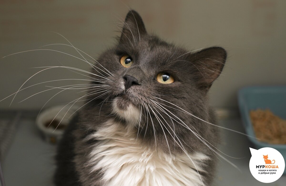 Очень теплый котик поселился в "Муркоше". Кажется, что Мартын пытался слизать солнышко языком, поэтому у него такое забавное пятнышко на подбородке. А что не слизал, то впитал в себя, чтобы согревать длинными, холодными вечерами своего нового хозяина. В придачу к пятнышку идут длинные белые усы на серенькой мордашке и очень умные, чуть лукавые глаза. А уж роскошному белоснежному жабо может позавидовать любой модник из семейства кошачьих. Свои солнечные ванны Мартын принимал на парковке, на которой был найден и привезен в приют "Муркоша". О чем мечтал котик, греясь на теплом асфальте, мы не знаем, но вероятнее всего мысленно рисовал себе свой дом, где будет спокойно и уютно. А еще он прикидывал в уме, сколько тепла нужно насобирать, чтобы обогреть своего Человека, растягиваясь вдоль него во весь свой рост, учитывая хвост. Возможно, произведя нужны расчеты, у него уже есть план по внедрению их в жизнь, так как Мартын совершенно спокойный, ласковый, добрый и контактный котик. И надолго