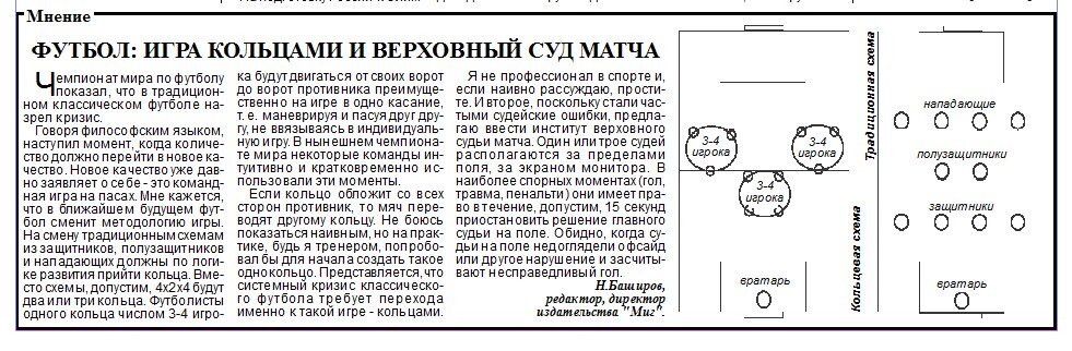 После чемпионата мира по футболу в 2010 году стало ясно, что судья не машина и его невольные ошибки приводят к возмущениям болельщиков всего мира. Что надо гарантировать справедливое судейство. Помнится, тогда в астраханской газете «Миг» от 25 июня 2010 была опубликована моя статья с предложением ввести институт верховного судьи матча. Один или трое судей располагаются за пределами поля, за экраном монитора. В наиболее спорных моментах (гол, травма, пенальти) они имеет право в течение, допустим, 15 секунд приостановить решение главного судьи на поле. Ведь обидно, когда судьи на поле недоглядели офсайд или другое нарушение и засчитывают несправедливый гол. Видимо, это становилось очевидным и не только мною предлагались такие меры. Вскоре был приятно удивлён тем, что судья в спорных ситуациях стал обращаться к видеоповторам. А с этим не поспоришь.