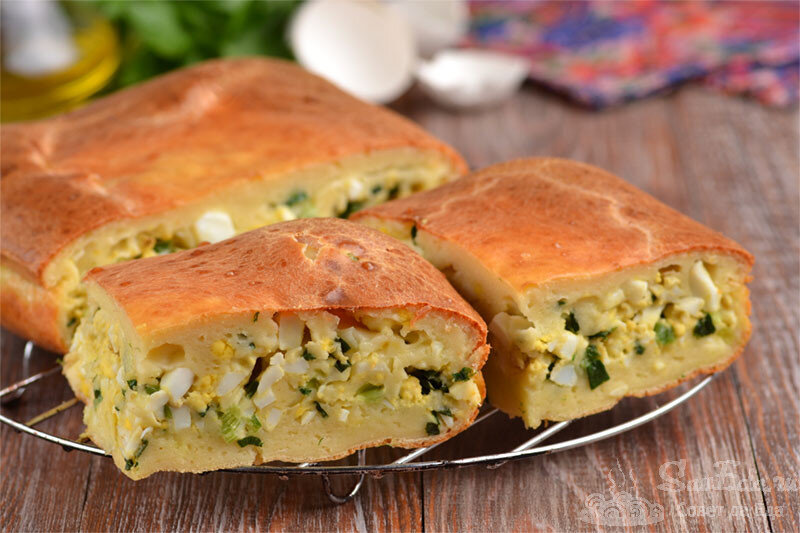 15. Вкуснейший заливной пирог с яйцом и луком нарезаем на порционные кусочки и сразу подаем на стол. Он отлично подойдет на завтрак, в качестве перекуса или к горячим первым блюдам. По такому принципу пирог можно приготовить с любой начинкой.