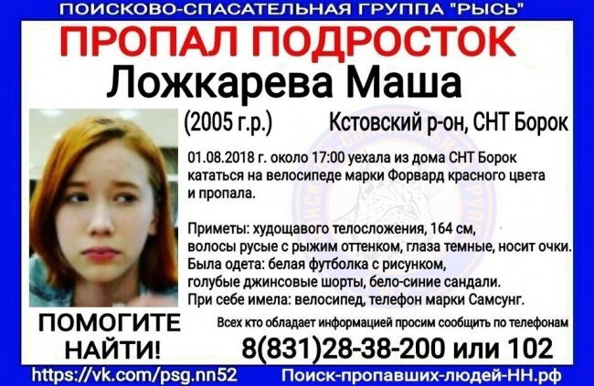 Вечером 19 июля 2019 года в нижегородских группах в социальных сетях появилась информация о том, что Машу Ложкареву нашли спустя почти год поисков. Ориентировка была подписана поисково-спасательной группой «Рысь». По версии авторов сообщений, девочка погибла. Напомним, 13-летняя Маша Ложкарева пропала 1 августа 2018 года. Девочка уехала кататься на велосипеде из СНТ Борок в Кстовском районе и с прогулки уже не вернулась. Машу несколько месяцев искала вся Нижегородская область. Добровольцы прочесывали местность: леса, поля - изучали кадры с камер видеонаблюдения и видеорегистраторов проезжавших мимо водителей. За любую информацию о судьбе Маши было объявлено вознаграждение в полмиллиона рублей. Однако все усилия оказывались напрасны: о местонахождении девочки не было никаких вестей. Когда появилась информация о том, что девочку нашли погибшей, это сразу вызвало резонанс среди интернет-пользователей. Как оказалось, информация была ложной. Более того, как сообщили участники ПСГ «Рысь», ч