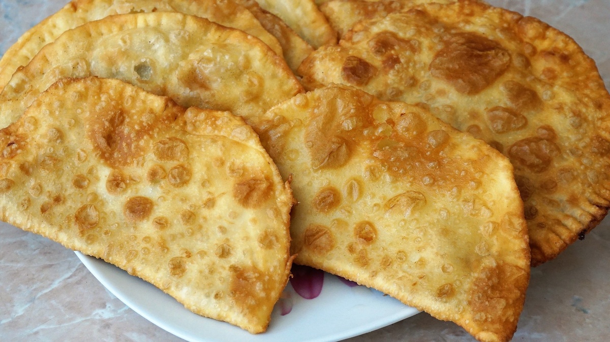 Хочется чего-то такого, не знаю чего? Пора готовить чебуреки! Делала их первый раз, мои смели все очень быстро, им понравилось! Для теста: 1.5 стакана воды (кипяток) 1 яйцо 4.5 стакана муки 2 ст. ложки растительного масла 0.5 ч. ложки соли Для фарша: 800 гр фарша (50*50 свинина-говядина) 1 луковица (большая) 1 стакан воды соль, перец, приправы по вкусу Берем с собой хорошее настроение и закрываем на кухню дверь, чтобы шпионы не таскали горячие чебуреки! Приступаем: В посуду для замешивания теста добавляем соль, растительное масло и вливаем 1.5 стакана кипятка. Высыпаем стакан муки и вымешиваем пару минут, чтобы тесто остыло. Далее добавляем яйцо и снова вымешиваем в однородную массу. После чего добавляем остальную муку и замешиваем тесто. Тесто должно получиться твердым. Делаем начинку: Берем фарш, добавляем лук, соль и перец. Чтобы чебуреки получились сочными, добавляем 200 грамм воды. Благодаря воде, при жарке в чебуреке появится много ароматного бульона. Раскатываем тесто и выкл