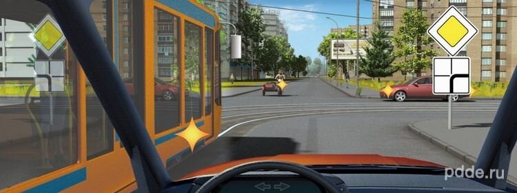 Предлагаем вам ответить на лёгкий вопрос связанный с правилами дорожного движения. На него будет ответить не только лицам,которые получают права,но и тем,кто их уже получил. Правильный ответ будет в конце статьи Задание: Кому Вы обязаны уступить дорогу при движении прямо? 1. Никому 2. Только трамваю 3. Трамваю и легковому автомобилю 4. Только легковому автомобилю 5. Мотоциклу Перекрёсток неравнозначный. Главная дорога меняет направление. Преимущество имеют транспортные средства, находящиеся на главной дороге, при этом безрельсовые транспортные средства между собой руководствуются «правилом правой руки», уступая трамваю, находящемуся с ними в равнозначных условиях. Вы уступаете дорогу трамваю и легковому автомобилю, которые проедут перекрёсток одновременно, так как их траектории движения не пересекаются. Мотоциклист уступает всем, потому что находится на второстепенной дороге. («Дорожные знаки», пункты 13.9, 13.10, 13.11 ПДД). Правильный ответ: 3 (Трамваю и легковому автомобилю)