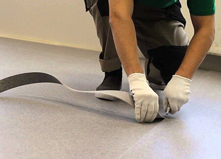 Линолеум распаковывают в сухом помещении, температура которого не должна быть меньше 15С. Все рулоны полностью раскатываются и адаптируются к окружающей среде в течение 24-48 часов. После этого производится раскрой линолеума с учетом усадки, возникающей при высыхании. Линолеум ПВХ дает усадку в 2%, а поэтому следует учитывать определенный допуск.