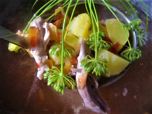 В самом конце варки,когда уже суп готов,положить в кастрюлю семенной венчик укропа.Буквально на минуту и обязательно убрать.