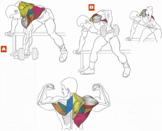 Тяга гантели одной рукой в наклоне – это формирующее упражнение, которое нужно использовать для устранения недостатков в симметричном развитии мышц спины. В первую очередь оно качает широчайшие и ромбовидные мышцы, а также нижнюю и среднюю часть трапеций. Выполняйте тягу одной рукой в наклоне по 8-12 повторений в 3-4 сетах. Исходное положение 1. Возьмите гантель в правую руку. Хват нейтральный: ладонь направлена на боковую часть бедра. 2. Станьте слева от скамьи и поставьте ноги вместе. Сделайте широкий шаг или же поставьте колено левой ноги на скамью. 3. Слегка согните правую ногу (или обе ноги, если ступни на полу), наклонитесь вперед и упритесь левой рукой в край скамьи. 4. Торс параллелен полу, а спина слегка прогнута в пояснице. 5. Правая рука полностью выпрямлена, и гантель «висит» на ней. Правое плечо немного опущено. Выполнение упражнения Сделайте глубокий вдох, задержите дыхание, напрягите мышцы спины и задние дельты и потяните гантель строго вверх. Старайтесь поднять ганте