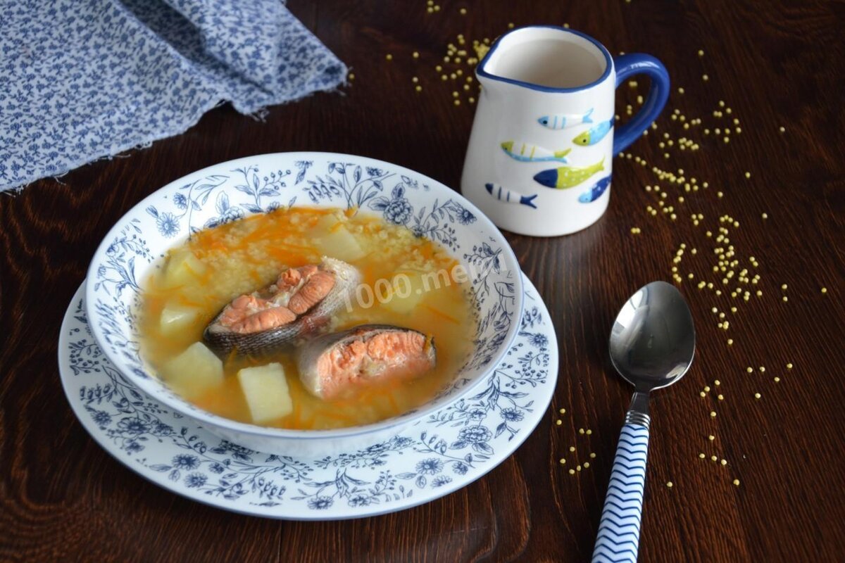 Давно у нас на канале не было первого блюда. Сегодня заполним этот пробел. Рекомендую простой рецепт «Уха с пшеном и красной рыбой». Интересно. Когда родилась уха, установить невозможно. Доподлинно известно лишь то, что блюдо готовили давным-давно. История уведомляет, что еще в XI-XII веках любой суп называли ухой, а также, навар из мяса и даже блюда, напоминающие сегодняшний компот. Лишь с конца XVII - начала XVIII века ухой стали называть только рыбный бульон. Супом называть такое блюдо неправильно. Поскольку уху не заправляли мукой, маслом, обжаренным луком и крупой. Время приготовления 1 час 15 минут Калорийность – 45 ккал/100 г Ингредиенты (6 порций) · лук – 1 шт; · пшено – 100 г; · вода – 2 литра; · соль – по вкусу; · картофель – 2 шт; · красная рыба – 350 г; · перец горошком – 3 шт; · морковка – 1 шт4 · душистый перец – 4 шт Подготовка ингредиентов Рыбку тщательно моем под проточной водой. Нарезаем стейками. Можно использовать любую красную рыбу по своему вкусу. Например, во
