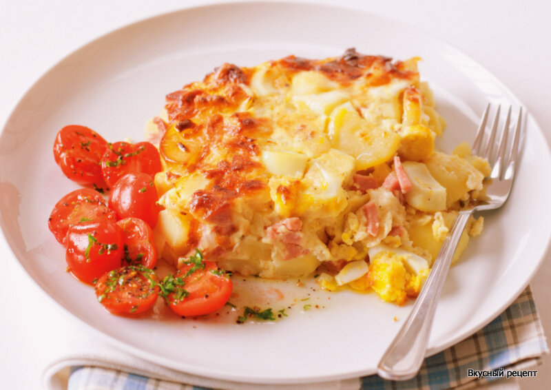 Сегодня приготовим популярное блюдо — французский картофель. Многие его готовят периодически или пробовали где-то вне дома. Но сегодняшний вкусный рецепт не совсем классический, потому что блюдо будет готово гораздо быстрее. Есть один секрет, сейчас его узнаем. Для приготовления блюда нам нужно: 1 кг молодого картофеля; 1 шт репчатого лука среднего размера; 3 шт куриных яйца; 300 г сметаны; 150 г сыра Эдам; 1 столовая ложка горчицы; 200 г Салями или ветчины; 500 г помидоров черри; 50 г петрушки; 50 г оливкового масла; чёрный перец молотый; соль. Моем картофель и варим его до готовности. Нарезаем его ломтиками шириной около 1 см и выкладываем в предварительно смазанную маслом форму для выпечки. Секрет заключается в том, что мы используем для запекания уже отваренный картофель, а в оригинальном рецепте следует использовать сырой. Но время его выпекания будет дольше, чем в нашем рецепте. Мелко нарезаем лук и добавляем в картофель. Два яйца отвариваем вкрутую и нарезаем крупными кубиками.