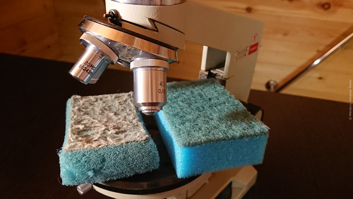 Изрядно поработав на кухне, губка для мытья посуды пришла в негодность. Ей на смену приходит точно такая же новая. Самое время рассмотреть их отличия в деталях с помощью микроскопа.