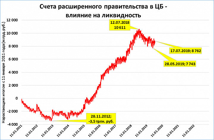 ЦБ в ежедневном режиме публикует факторы формирования ликвидности банковского сектора. Что показывают эти данные? Операции правительства с июля 2018 года отрицательно влияют на ликвидность банковского сектора: Это собранные в виде налогов, и взятые в долг у населения и предприятий деньги – в той части, в которой они были «законсервированы» на счетах Казначейства в ЦБ. (См. также "О действиях Правительства, мешающих экономическому росту").