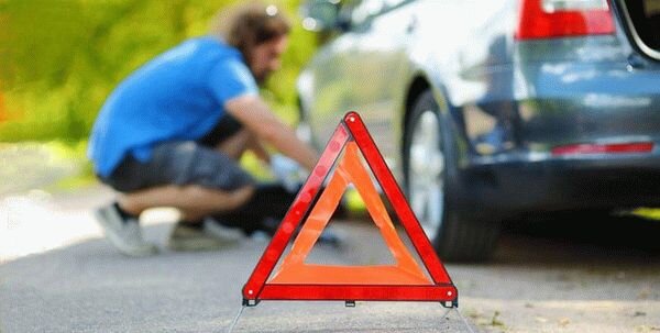 - Остановить авто, проверить бак на наличие утечки топлива, включить аварийку и установить аварийный знак. В населенном пункте знак устанавливается на расстоянии 15 м от авто, за городом 30 метров.