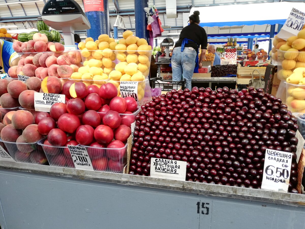 А вот эта черешня по 2 доллара, но какая-то совсем уж пересортица. Не, спасибо, не надо. А вот к абрикосам, которые теперь заполонили рынок и которые стоят по две копейки пучок - от 1,5 долларов за кг - я к ним равнодушна. Помидорки тоже белорусские, кстати. Яблочки тоже белорусские уже пошли. По доллару плюс минус за кило. Вишни тоже немерено, с