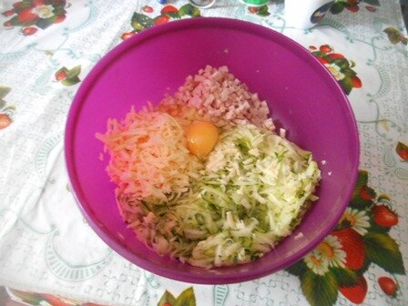 Почему летние? Конечно кабачки продают в супермаркетах и зимой. Но в больших количествах они вырастают на грядках именно летом. Наша семья очень любит такие оладьи. Я хочу поделиться с вами этим рецептом. Берем один маленький кабачок или половинку большого. У большого кабачка нужно почистить кожуру. Она у него жесткая. И убираем семена. Трем на крупной терке или пропускаем в мясорубку. Молодой кабачок используем вместе с кожурой. Также нужно натереть на терке 100-150 гр. сыра. Мелко порезать 4 кружочка вареной колбасы или ветчины. Разбиваем 1 яйцо. Солим совсем немного, буквально одну щепотку. Сыр и колбаса дают соль тесту. Все перемешиваем. Добавляем пшеничную муку. Перемешиваем. Каждая хозяйка сама решает сколько муки насыпать. Много муки насыпать – получить более плотные оладьи. Мало – очень мягкие, но их труднее переворачивать. Есть классическое определение для теста – густая сметана. Разогреваем сковороду. Наливаем растительное масло. Выкладываем тесто. Обжариваем оладьи с двух