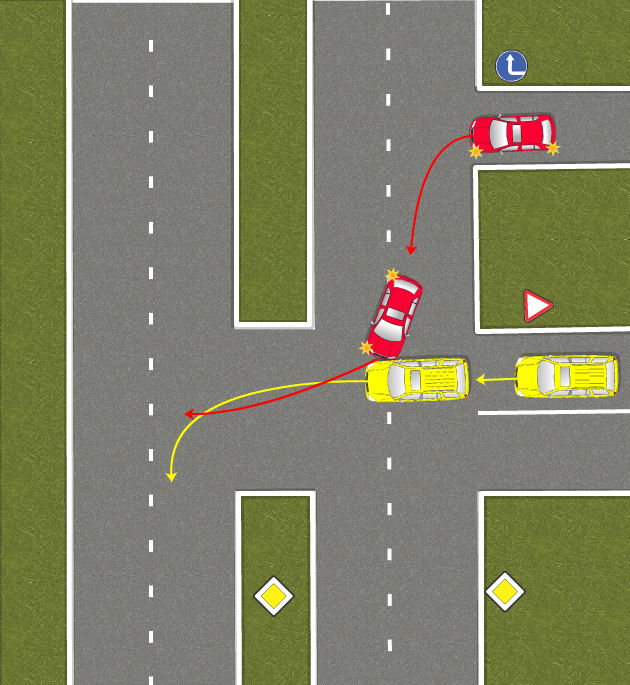 Здравствуйте! Снова ДТП на перекрёстке. Снова помеха справа. Сразу оговорюсь, что эта ситуация взята не из учебников или билетов по ПДД, а из реальной жизни. В ней участвовали конкретные люди и конкретным инспектором ДПС, вынесено конкретное решение. Итак. Жёлтый автомобиль приближается к перекрёстку по второстепенной дороге, где намеревается повернуть налево. Главная дорога имеет 2 проезжих части, по 2 полосы. Каждая проезжая часть имеет своё направления движения. В середине разделительный элемент в виде газона. Для поворота налево необходимо пересечь первую проезжую часть и повернуть на вторую. Вроде бы всё ясно. Куда, в данной ситуации, следует смотреть водителю жёлтого автомобиля? Вы бы куда смотрели? Естественно туда, откуда следует уступить дорогу. Туда откуда может быть опасность. То есть налево. Вот он туда и смотрел. Убедившись, что слева никого нет, выехал на перекрёсток. В это же самое время, водитель красного автомобиля, выезжая с прилегающей территории (со двора), тоже н