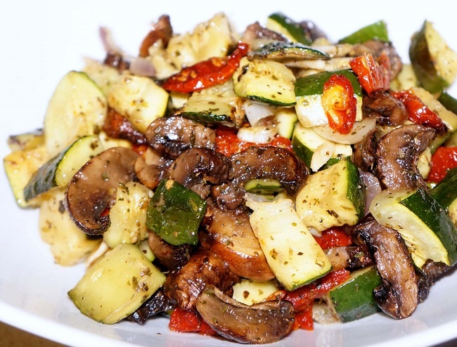 ИНГРЕДИЕНТЫ подсолнечного масла кабачков (маленькие) 4 шт. специй по вкусу чеснока 2 зубца грибов 0,5 кг луковица 1 шт. перцев сладких 2 шт. пасты томатной 15 г кетчупа 15 г Заходите на мой сайт и читайте ещё больше новых рецептов Как приготовить: Овощи помыть, у перца удалить семена, а мякоть порезать крупными кубиками. Кабачок порезать кубиками, удалив при необходимости семена и кожуру. Грибы промыть и порезать на небольшие ломтики. Лук и чеснок почистить, луковицу мелко нашинковать. В сковороде разогреть растительное масло и обжарить лук вместе с кабачками и грибами. Готовить 15 минут, периодически помешивая. Затем добавить перец и чеснок, тушить 10 минут на умеренном огне. Затем добавить томатную пасту с кетчупом, посолить и перемешать. Довести овощное рагу до кипения и можно сразу же подавать на стол. ПРИЯТНОГО АППЕТИТА! Если Вам понравилась статья, ставьте лайк и подписывайтесь на мой канал в Яндекс.Дзен!