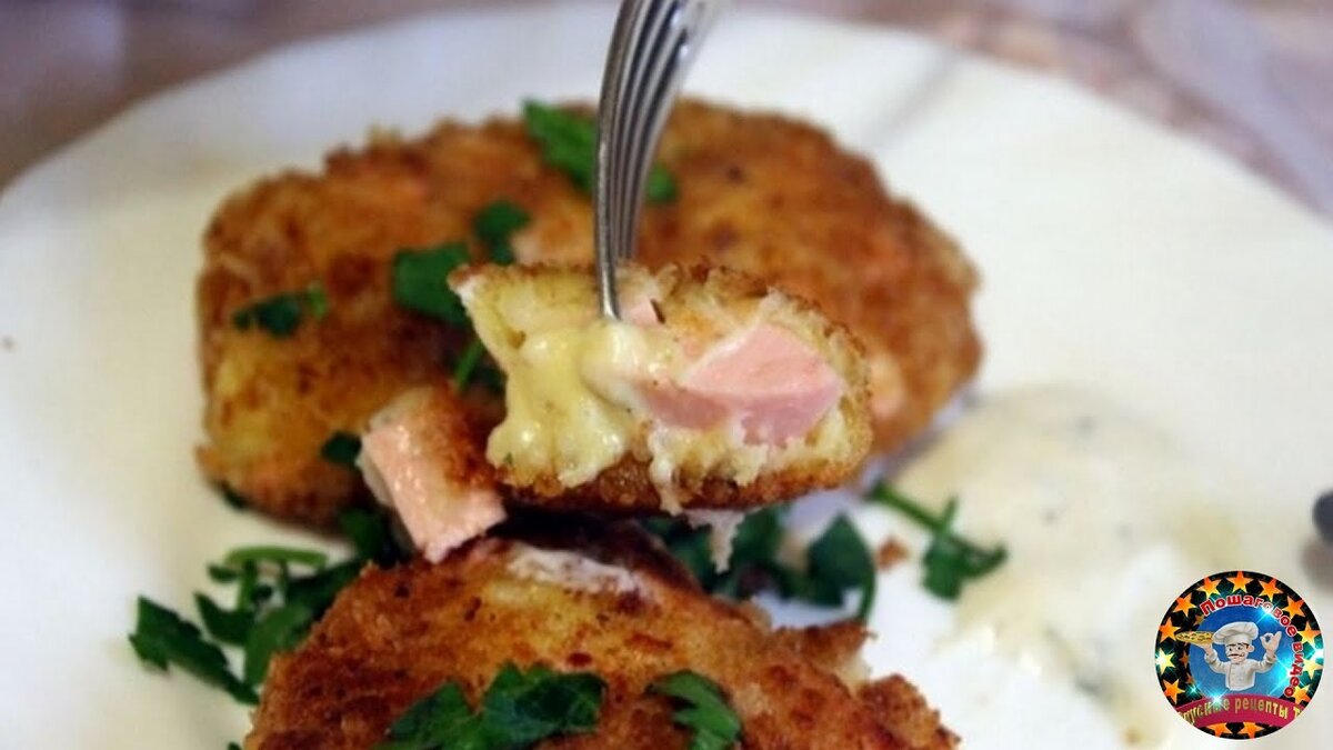 Из картофельного теста сформировать лепешку, в центр положить брусочек сыра и обжаренную колбасу.Придать изделию форму котлеты и запанировать в сухарях. На сковороде с разогретым растительным маслом обжарить котлеты до румяного цвета на среднем огне с двух сторон.