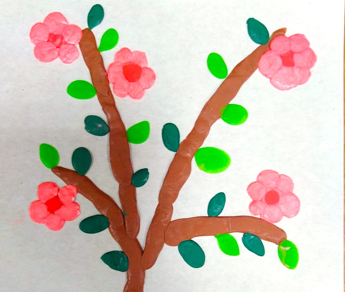 Для работы нам понадобятся: белый картон, простой карандаш, пластилин. Вначале нужно сделать набросок - нарисовать стебли. Теперь начинаем приклеивать пластилин на стебли. Вначале кусочек коричневого пластилина раскатываем в колбаску потоньше и прикладываем по линиям карандашного наброска, чуть прижимая пальцем пластилин, чтобы приклеился. Таким образом делаем все стебли. Затем переходим к цветам. Для этого нам понадобится два цвета: розовый и оранжевый. Скатываем кружочки из розового пластилина, для одного цветка нам нужно 5 или 6 шт., распределяем их покругу и тоже приплющиваем пальцем. Затем в центр цветочка приклеиваем шарик из оранжевого пластилина. Повторюсь еще раз, все хорошо прижимаем пальчиком. Цветочки лучше приклеивать на края стебля, но не забывайте при этом, что цветов должно быть нечетное количество. Когда сделаны стебли и цветы, приклейте листики. Скатайте шарик, немного придайте ему форму овала и приклейте так, чтобы край овала- листика, прикасался к стеблю. Использ