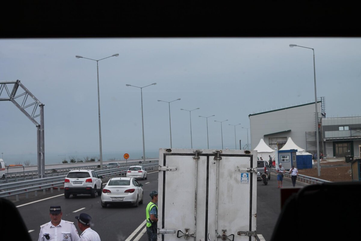 Не совсем понятный факт -почему останавливают автобусы , а автомобили выборочно?Происходит это следующим образом. В самом начале моста стоит пост.Все рейсовые автобусы останавливают.Просят выйти всех с ручной кладью. При чем автобусы образуют очередь так как процесс этот не быстрый.Собирается очередь из автобусов и людей. Далее в автобус заходят люди со специальными собаками и приборами. Проверяют салон,проводят его осмотр.Затем открывают багажный отсек и проверяют там. А люди в это время идут с вещами к палаткам: В палатках у каждого досматривают багаж,потом каждый проходит через металлоискатель,В довершении этого проводится паспортный контроль.У человека берут паспорт,проверяют его в компьютере. Вообщем "на все про все" уходит по времени полчаса-час.Чуть меньше чем на переправе,но все равно,быстро промчатся по мосту рейсовым автобусом не получается.