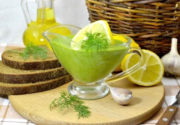 Добрый день, уважаемые читатели! Хочу поделиться с Вами рецептом вкуснейшего соуса, который будет великолепно сочетаться с различными продуктами. Я советую готовить этот соус прямо сейчас, пока укроп еще молоденький и сочный. Приготовить соус-заправку из укропа очень легко и быстро, а хранить в холодильнике можно 2-3 месяца. А если соус немного потемнеет, это не беда (кушать его можно!). Для приготовления 250 мл. соуса нам потребуется: Укроп примерно 200 грамм Чеснок 10 зубков Лимон 1 штука Оливковое масло 100 мл. Соль по вкусу. Приготовление: Веточки укропа (можно взять мягкие стебли и соцветия) моем под проточной водой и обсушиваем. Рубим укроп на небольшие кусочки. Зубчики чеснока мы нарубим на крупные кусочки, так как всю заправку еще предстоит превратить в пюре при помощи блендера. Перекладываем укроп и чеснок в глубокую миску. На мелкой терке натираем цедру лимона, добавляем ее к укропу и чесноку. Выжмем туда же лимонный сок, вливаем оливковое масло, подсаливаем. При помощи б