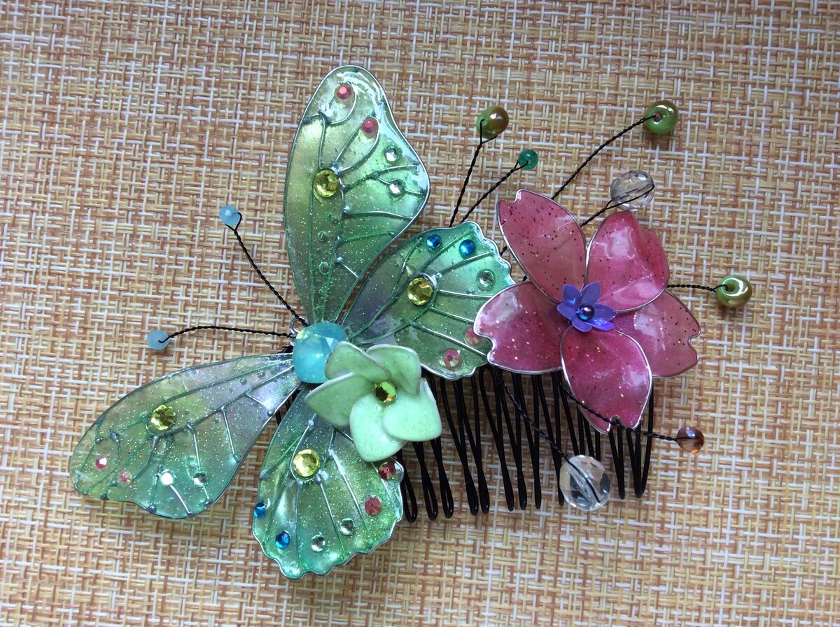Сделаем сегодня с вами заколку из уф смолы с витралью и Светлана Федоровна нам покажет поэтапно как это сделать. Возьмем чисты лист бумаги и на нем нарисуем ту бабочку, которую мы хотим сделать. По этому эскизу мы с помощью проволоки будем делать крыло бабочки и в этом нам поможет паяльник для фиксации проволоки. Паяльником каждую точку будем фиксировать на всех участках крыла. Теперь опустим наше крыло в баночку с витралью и постарайтесь медленно поднять его от туда. Для быстроты слегка покроем крыло уф смолой и оправим сушиться под уф лампу. Теперь разноцветным ворсом начнем покрывать наши крылья. Зеленым неоновым красителем смешанным с уф смолой покрой верхнею часть крыльев. Разместим разноцветные стразы по поверхности крыла и скрепим их с помощью уф смолой. Фиксируем стразы. Создаем лепестки цветка из проволоки. Опускаем в баночку с витралью. Раскрашиваем лепесток составом из красителя красного цвета смешанного с блестками и уф смолой. Наши заготовки готовы к соединению. Приступаем