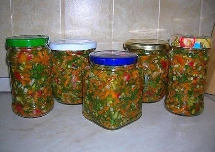 Морковку потереть на крупной терке. Лук и перец нарезать на тонкие полоски. С помидоров снять кожицу и тоже нарезать. Зелень мелко нарезать. Добавить соль (если "экстра", то 400 гр.) и все перемешать. Через 10 минут разложить заправку (выделившийся сок тоже) в банки и накрыть капроновыми крышками. Заправка хорошо хранится при комнатной температуре. С указанного количества овощей получилось 4 банки по 0,5 л. источник Этот и тысячи других рецептов в приложении Cookpad Бесплатно и Без рекламы! Скачать для iOS Скачать для Android